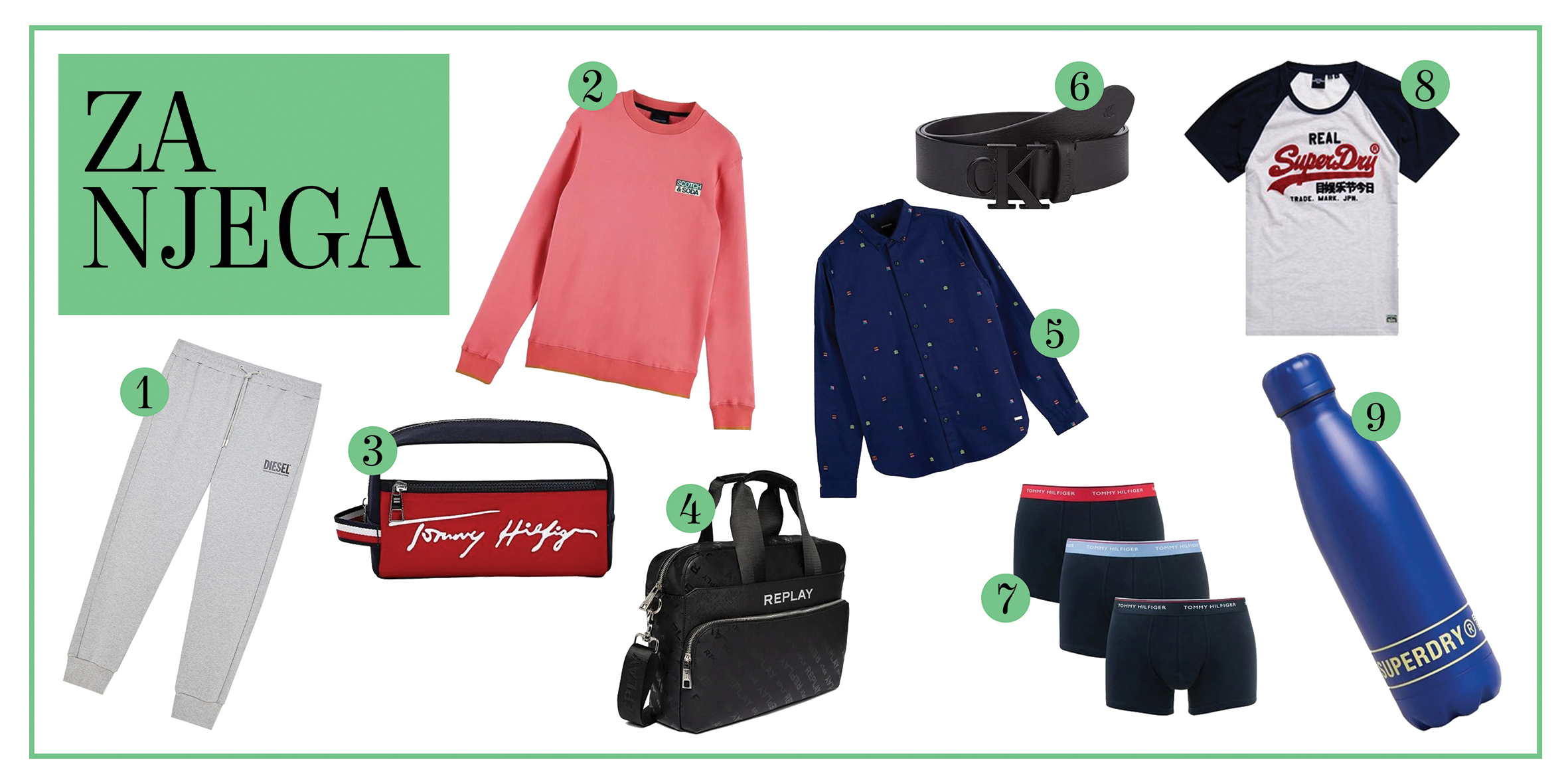 Diesel trenerka, Scotch&Soda duks, Tommy Hilfiger neseser, Replay torba za laptop, Scotch&Soda košulja, Calvin Klein kaiš, Tommy Hilfiger veš, Superdry majica, Superdry flaša za vodu