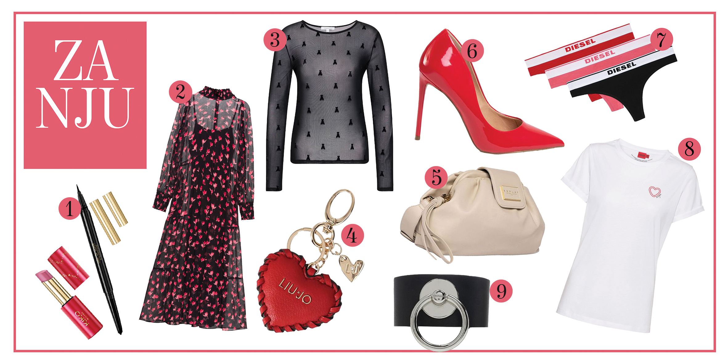 KIKO Milano perfect look kit, HUGO maxi haljina, Patrizia Pepe bluza, Liu Jo privezak, Replay torbica, Steve Madden salonke, Diesel veš, HUGO majica, Diesel kožna narukvica
