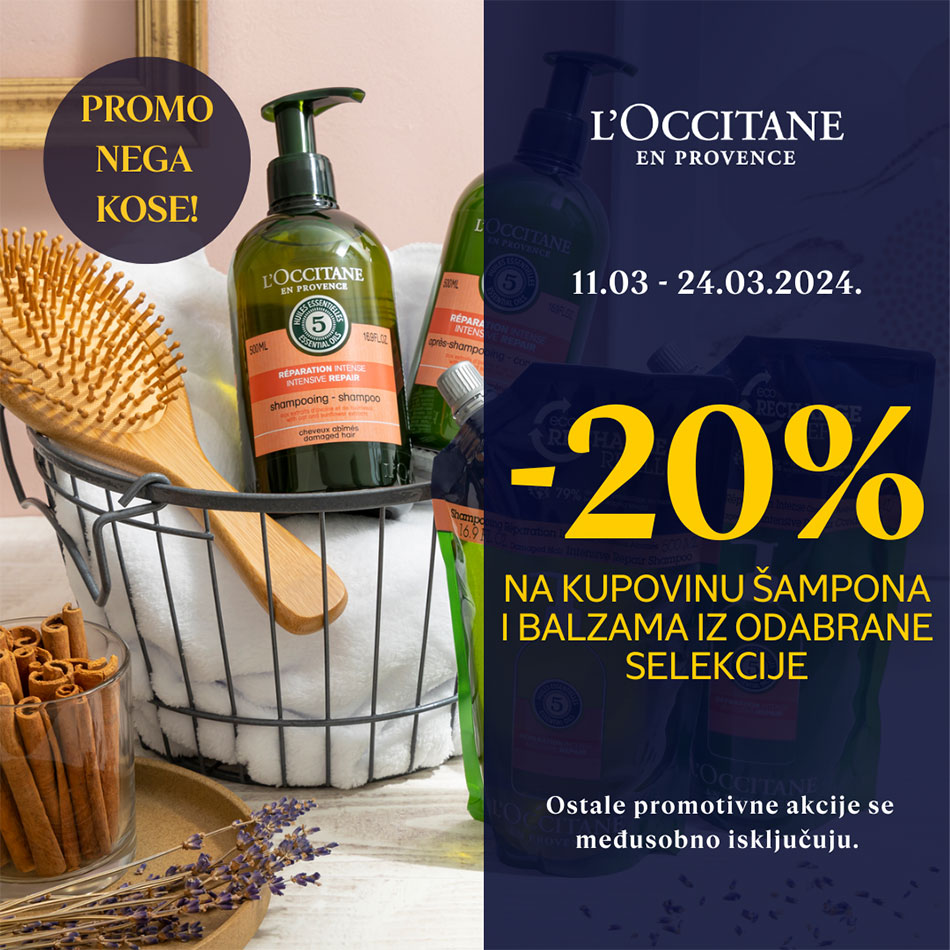 Obradujte svoju kosu! Do 24.3. iskoristite 20% popusta na odabrane šampone i balzame za kosu. Ne propustite priliku za negu koju vaša kosa zaslužuje!