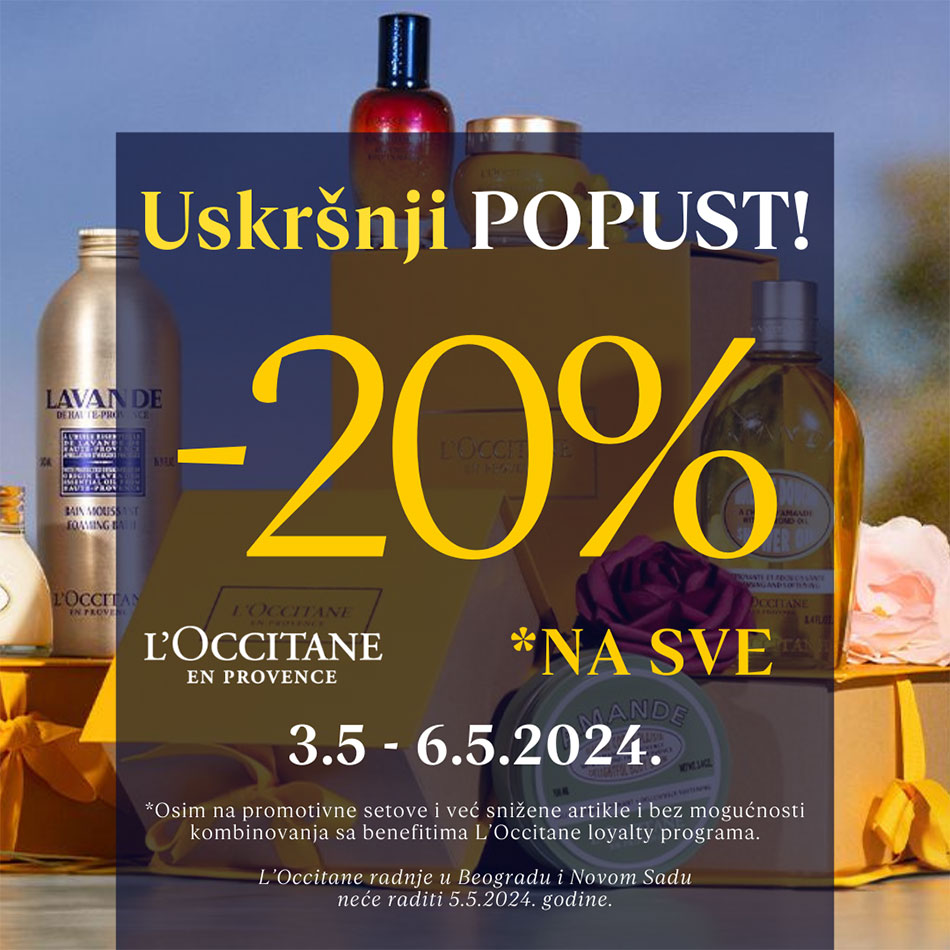 Od 03.05. – 06.05.2024. čeka vas -20% popusta NA SVE osim sniženo i promotivne setove! Pronađite savršen poklon, poklonite ljubav & pažnju uz L’Occitane kolekcije za negu lica, tela, kose i odabrane mirise, stvorene sa najprefinjenijim provansalskim sastojcima. Ko bi odoleo mirisnoj čaroliji koja donosi Provansu u divnom pakovanju? *Kombinacija sa benefitima loyalty programa nije moguća.