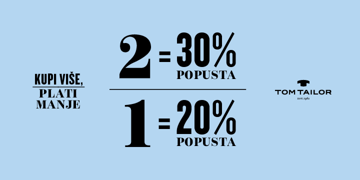 20% popusta za kupovinu 1 artikla i 30% popusta prilikom kupovine 2 artikla samo do 2.7. u radnjama Tom Tailor.