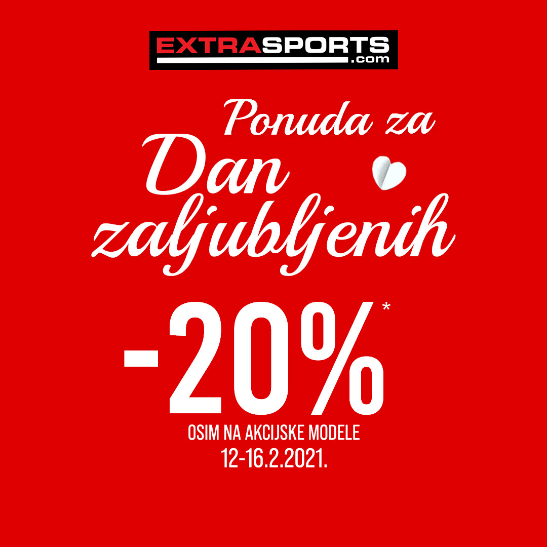 20% POPUSTA za ljubav koja traje u Extra Sports! Svi vasi omiljeni brendovi na jednom mestu: Nike, Adidas, Reebok, New Balance, Lotto, Skechers i mnogi drugi! Posetite nas na i obradujete one koje volite, i sebe! Vidimo se u Extra Sportsu, od 12. do 16.2!