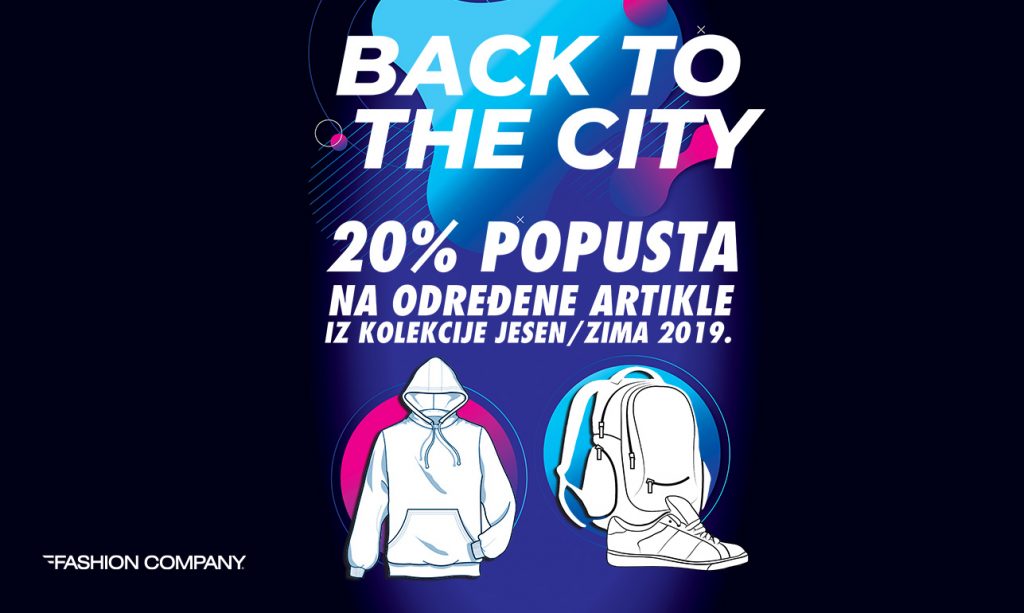 Septembar u životima mnogih od nas označava novi početak. Fashion Company je pripremio posebnu modnu poslasticu za sve. U okviru akcije BACK TO THE CITY, samo od 29. avgusta do 1. septembra imaćete priliku da upotpunite svoju odevnu kombinaciju za prve školske dane ili povratak na posao uz popust od 20% na određene artikle iz sezone jesen/zima 2019. Tako brendovi Guess, Tommy Hilfiger, Diesel i Fashion&Friends omogućavaju 20% popusta na dukseve i rančeve iz nove kolekcije, dok Bata daje 20% popusta samo na patike. Američki brend Levi’s je obezbedio popust od 20% na dukserice, dok Timberland snižava patike i torbe. Španski brend Mango za ovu priliku daje 20% popusta na sav asortiman. Očekujemo vas u našim radnjama u Ušće shopping centru. Napravite idealnu modnu kombinaciju za prve školske dane.