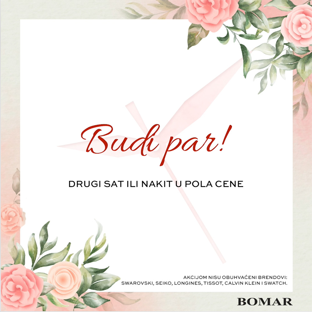 Povodom praznika ljubavi pripremili smo Vam neodoljivu ponudu. BUDI PAR i drugi sat ili nakit odaberi U POLA CENE. Posetite Bomar u UŠĆE Shopping Center i odaberite Vaš savršen par.