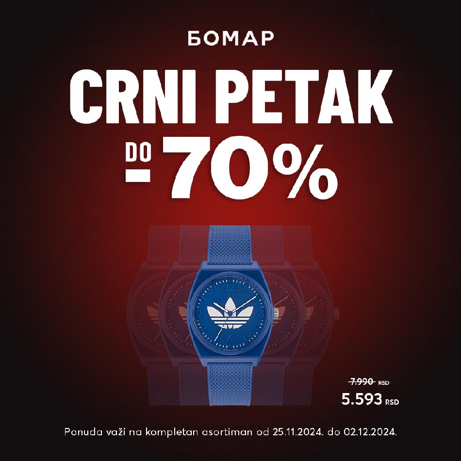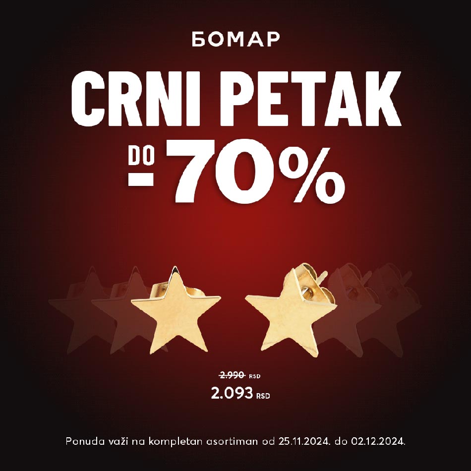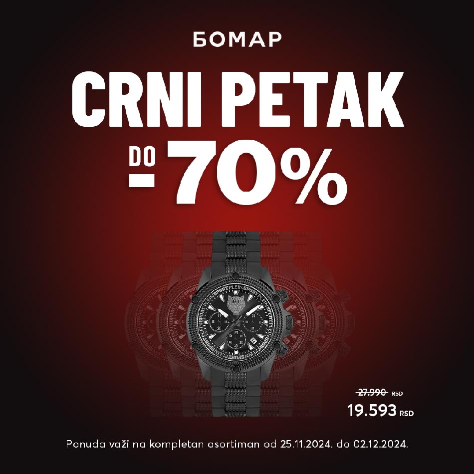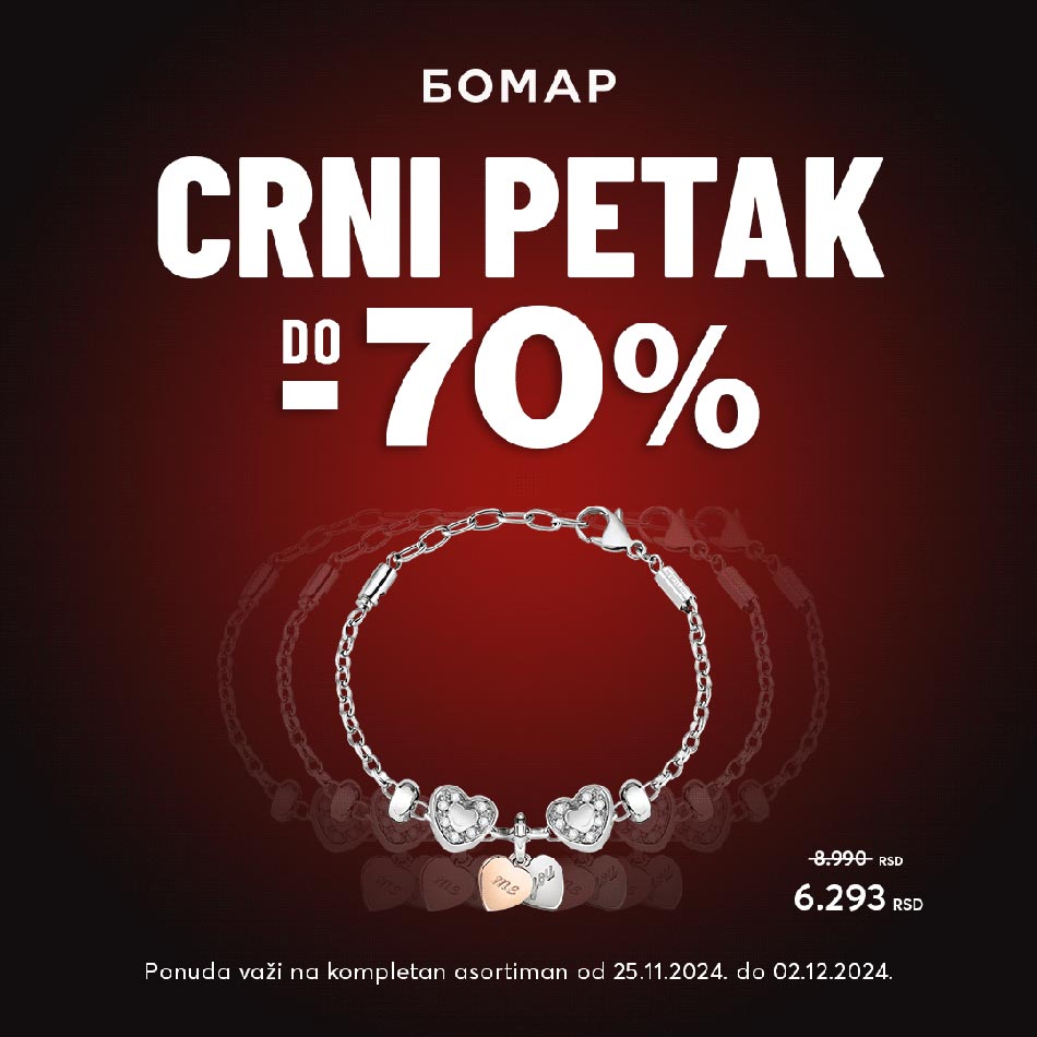 CRNI Petak je počeo! U BOMARu te ocekuje popust do 7️⃣0️⃣% na kompletan asortiman satova, nakita i aksesoara. Požuri. Količine su ogranicene. Ponuda vazi do 02. decembra ⌚️💍