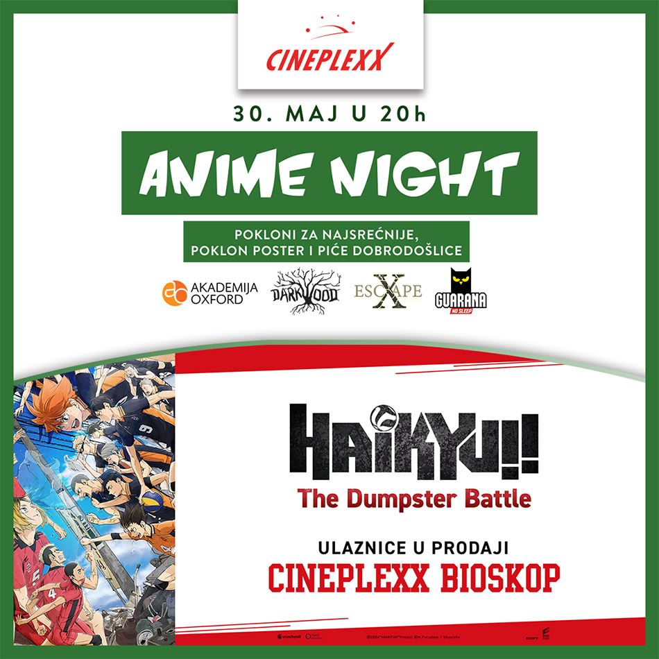U četvrtak, 30. maja od 20h, u Cineplexx 4D Delta City bioskopu vas očekuje nova anime zabava uz film „Haikyuu!! The Dumpster Battle”. Za sve naše anime fanove, spremili smo još jedno sjajno druženje uz piće dobrodošlice, postere iz filma*, kao i popularnu kpop muziku koja će upotpuniti atmosferu! Najsrećniji posetioci Cineplexx bioskopa imaće priliku da se osveže uz najnoviju Guaranu Azijanu i da dobiju posebne poklone, kao što su mange Darkwood izdavaštva, vaučeri za uzbudljiv provod u tematskoj anime sobi X Escape Rooms-a, i vaučer za kurs japanskog jezika u Akademiji Oxford.