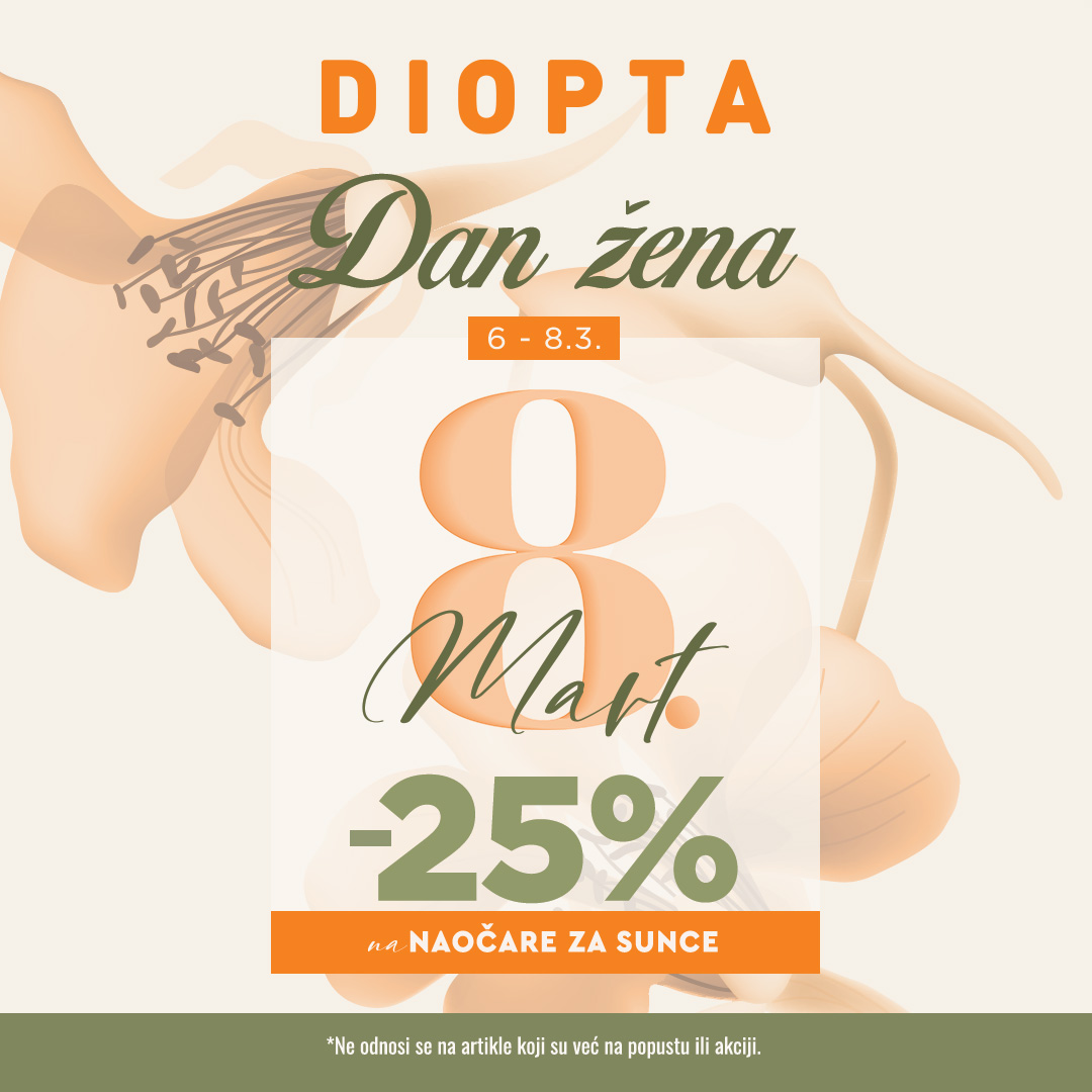 Povodom Osmog marta, u DIOPTA radnji vas očekuje odličan POPUST od -25% na naočara za sunce, u periodu od 6. do 8.3.2021.