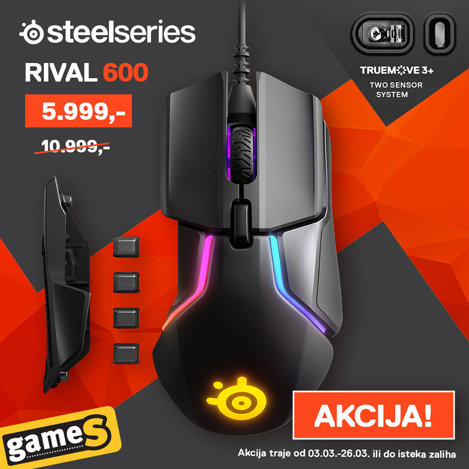 Potpuna kontrola težine i balansa, 60 miliona klikova, TrueMove 3+ senzori. SteelSeries Rival 600 je na velikom akcijskom sniženju do 26. marta ili isteka zaliha u GameS prodavnici.