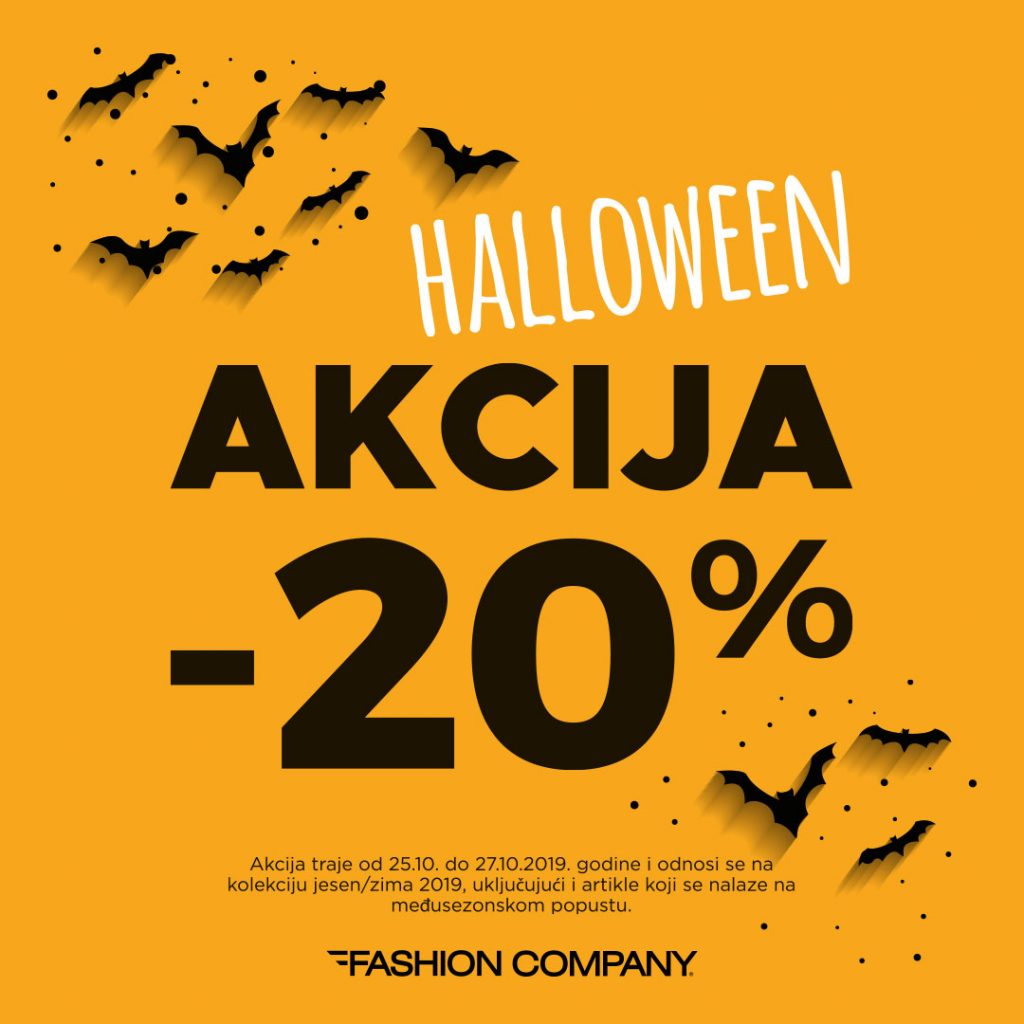Pripremite se za šoping avanturu ovog vikenda, uz specijalnu HALLOWEEN akciju u svim prodavnicama Fashion Company. Samo od 25. do 27. oktobra možete da ostvarite 20% popusta na kolekciju jesen/zima 2019. Akcija se odnosi i na artikle koji se već nalaze na međusezonskom popustu.
