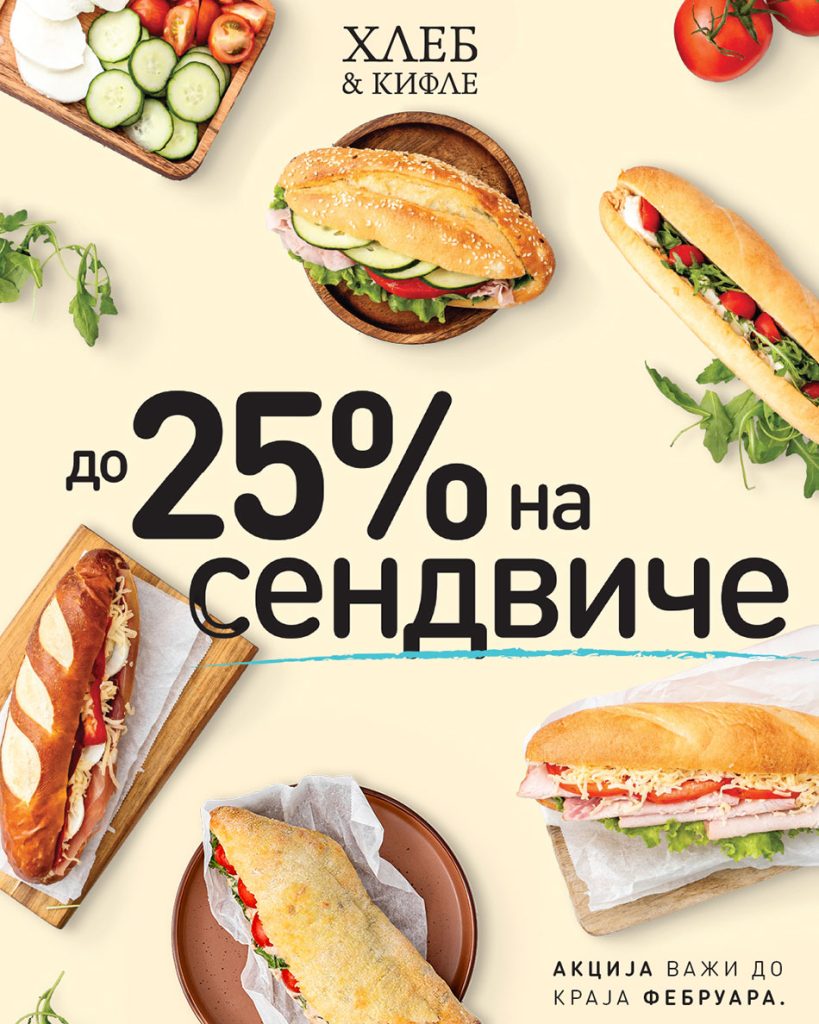 U pekari Hleb&Kifle očekuje vas akcija na sve sendviče, uz popust do 25%.Akcija važi do kraja februara.