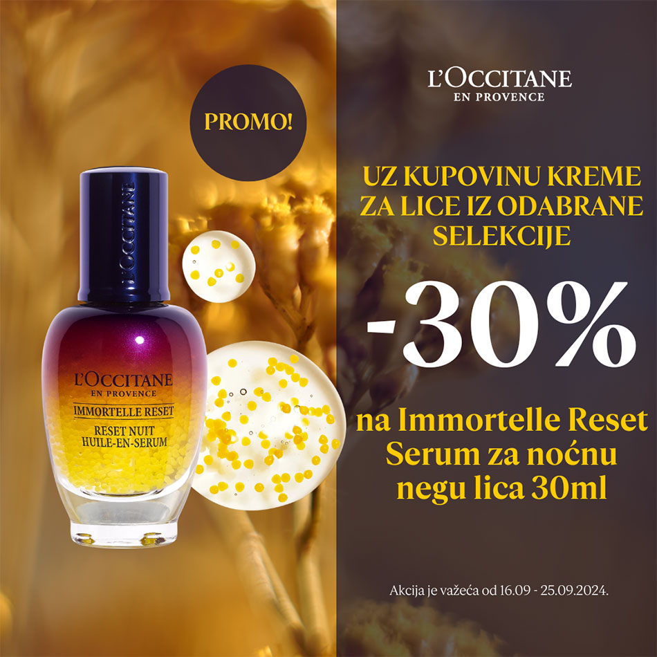 🌟 Iskoristite 30% popusta na Immortelle Reset serum za noćnu negu lica (30ml) uz kupovinu bilo koje kreme za lice iz odabrane selekcije i obradujte svoju kožu vrhunskom negom. 🛍️ ⏳ Ponuda važi od 16.09. do 25.09.2024. ili do isteka zaliha. Ne propustite priliku! ✨
