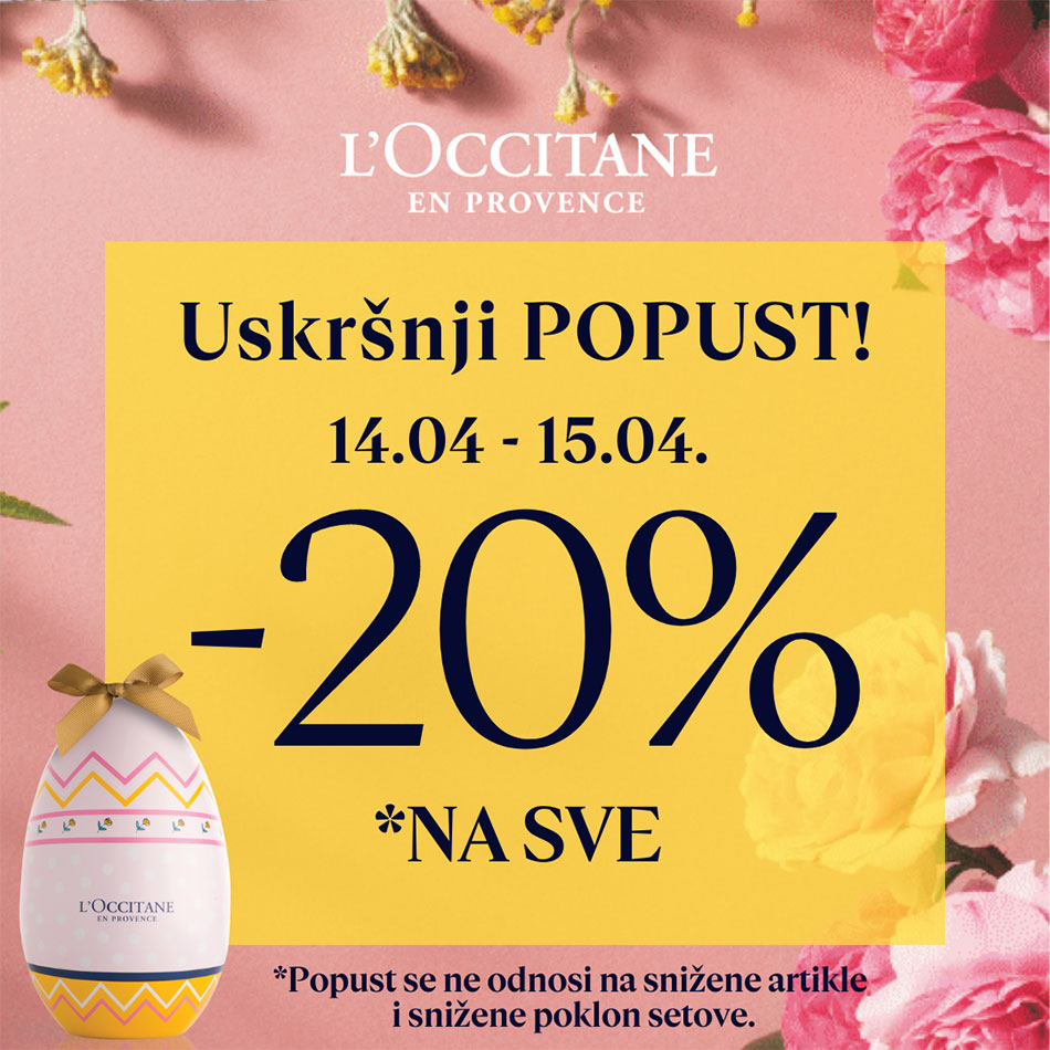 Od 14.04 – 15.04. vas čeka 20% popusta na celokupni asortiman, osim na već snižene proizvode i snižene promotivne setove. Akcija se ne može kombinovati sa benefitima L’Occitane Loyalty programa. Pronađite savršen poklon, poklonite ljubav & pažnju uz L’Occitane kolekcije za negu lica, tela, kose i odabrane mirise, stvorene sa najprefinjenijim provansalskim sastojcima.