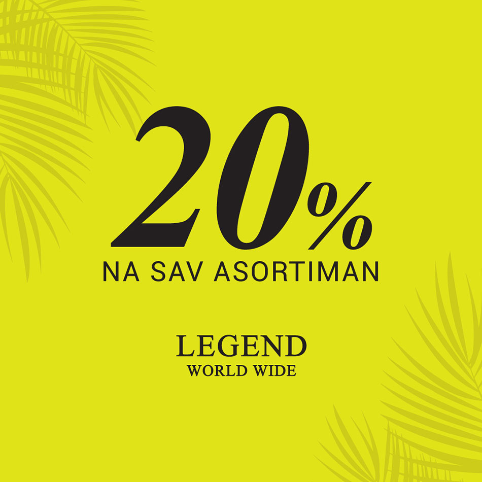 U Legend World Wide maloprodaji očekuje vas sjajna akcija! U periodu od 12.08. do 15.08. sav asortiman biće na 20% popusta. Popust se ne odnosi na artikle iz basic asortimana i artikle iz kolekcije jesen/zima 2021. Očekujemo vas da i ovog vikenda uživamo u kupovini!