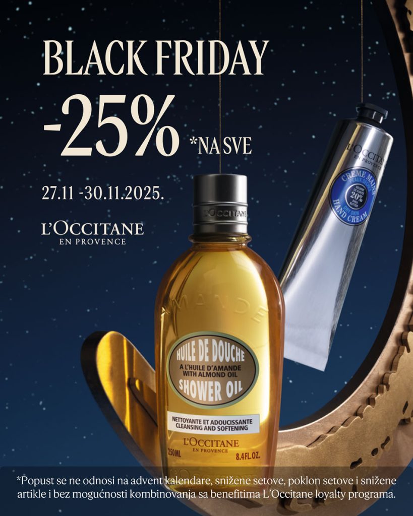 ✨ L’OCCITANE Black Friday! ✨ -25% popusta na *SVE vaše omiljene proizvode! 💛 Od 27.11. do 30.11.2025. *Napomena: *Popust se ne odnosi na advent kalendare, snižene setove, poklon setove i snižene artikle i u L’Occitane radnjama bez mogućnosti kombinovanja sa benefitima L’Occitane loyalty programa. Različiti popusti i promocije međusobno se isključuju. Požurite i obezbedite svoje favorite po sjajnim cenama!