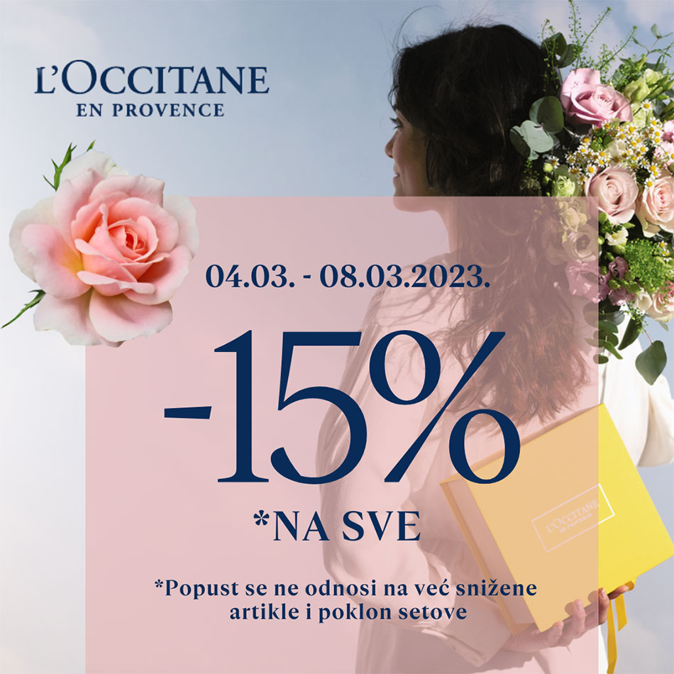 Od 04.03. – 08.03.2023. čeka vas -15% popusta NA SVE osim sniženo i poklon setove! Pronađite savršen poklon, poklonite ljubav & pažnju uz L’Occitane kolekcije za negu lica, tela, kose i odabrane mirise, stvorene sa najprefinjenijim provansalskim sastojcima. Ko bi odoleo mirisnoj čaroliji koja donosi Provansu u divnom pakovanju? *Kombinacija sa benefitima loyalty programa nije moguća.