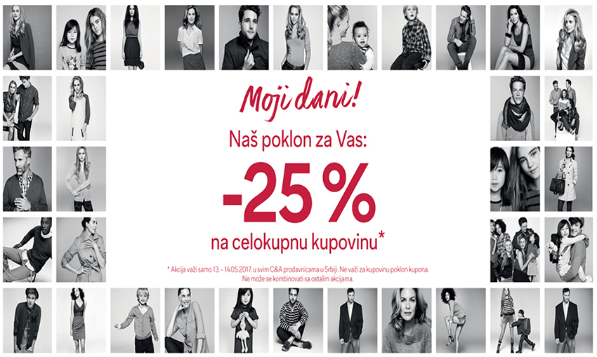 -25 % na celokupnu kupovinu u svim C&A radnjama. Akcija traje od od 13.05. do 14.05.2017.