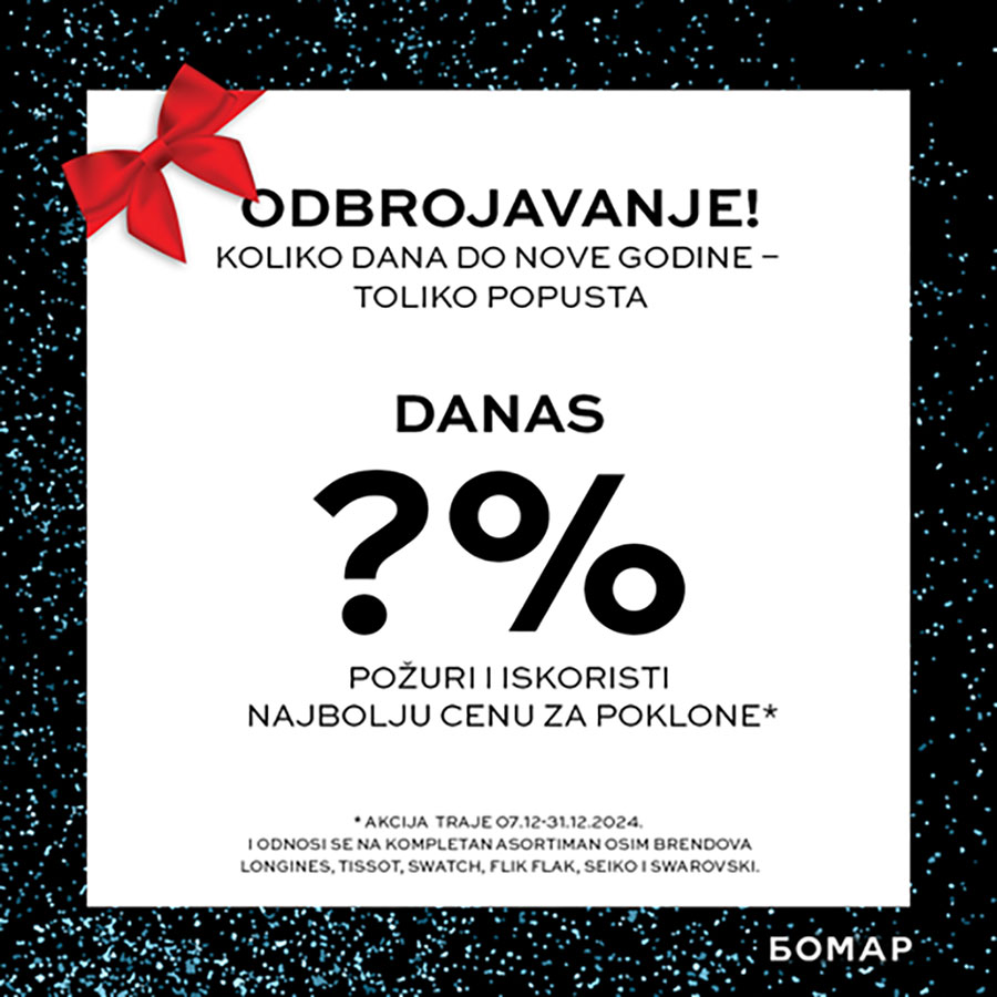 ODBROJAVANJE u BOMARu je počelo! Danas – 22% na kompletnu kolekciju osim brendova koji su izuzeti iz promocije. Kao i svake godine, najlepši praznici su u BOMARu jer KOLIKO DANA DO NOVE GODINE TOLIKO POGODNOSTI! Požuri… najlepši satovi, nakit i aksesoari, sada su dostupni po neverovatnim cenama.