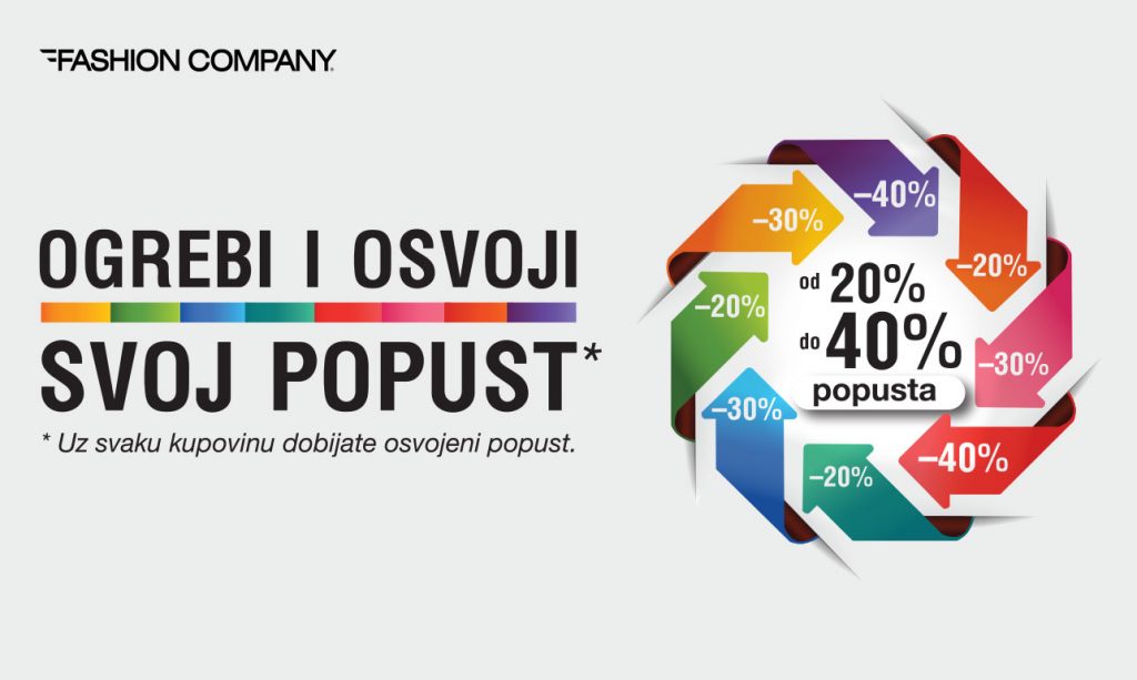 Uveliko radite na modnim pripremama za dugo priželjkivano proleće, vreme je novu šoping avanturu. Zagrejte svoje prste! U prodavnicama FASHION COMPANY od 17.05.2019. startovala je akcija OGREBI & OSVOJI POPUST od 20 do 40% koji se obračunava na aktuelne cene proizvoda iz kolekcije proleće/leto 2019, uključujući i artikle koji su deo MID SEASON SALE ponude. Prilikom kupovine na kasi se obračunava popust koji ste ogrebali na kuponu. U akciji ne učestvuju artikli brendova PREMIATA (Izuzev modela ANDY), GUESS (nakit, satovi i naočare), TOMMY HILFIGER (satovi i plažni program), BATA, PACIOTTI i CAMPER (sredstva za održavanje) i CALVIN KLEIN (veš i plažni program). Maksimalni iznos računa po jednom kuponu je 100.000 RSD. Očekujemo Vas u našim radnjama FASHION&FRIENDS, DIESEL, TOMMY HILFIGER, LEVI’S, GUESS, TIMBERLAND, BATA, MANGO I CALVIN KLEIN UNDERWEAR u Ušće shopping centru.