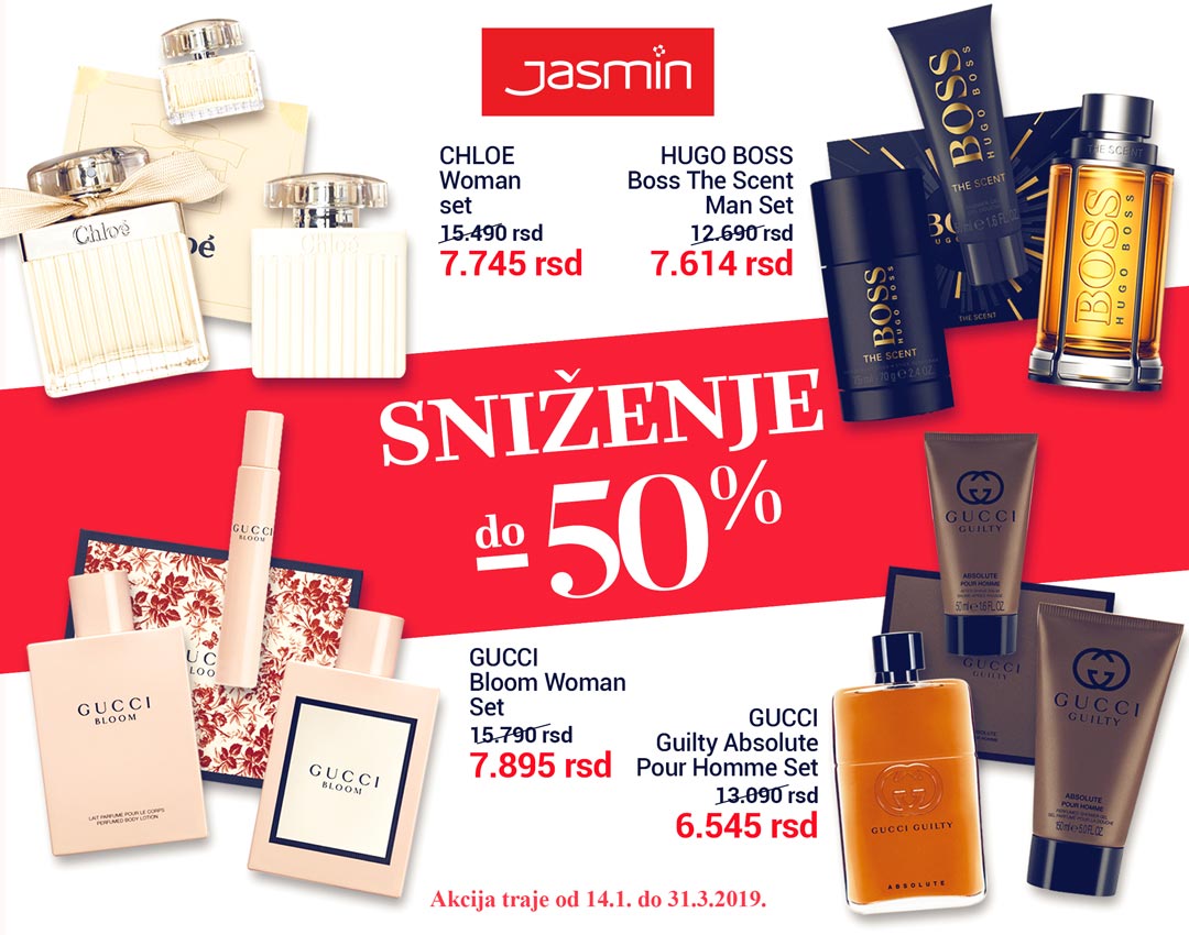 Počelo je veliko sniženje parfemskih setova u JASMIN parfimerijama. Posetite nas, možda je baš vaš omiljeni parfem u setu snižen do 50% ili ćete nekoga obradovati idealnim luksuznim poklonom. Ponudu možete pogledati i na linku JASMIN