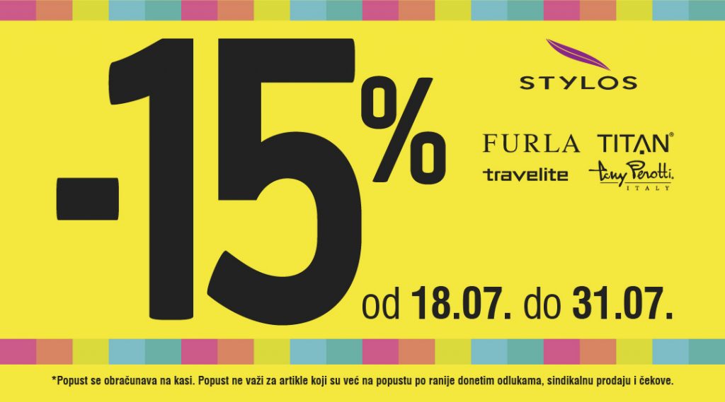 Posetite našu radnju od 18. do 31. jula i iskoristite 15% popusta na brendove FURLA, TITAN, TRAVELITE i TONY PEROTTI. Iskoristite popust i uživajte u kupovini.
