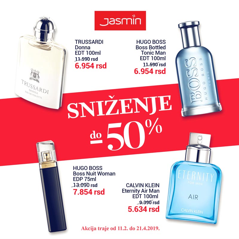 Rani vesnici najavljuju proleće koje u nama budi inspiraciju za promenom i želju za novim. Posetite JASMIN parfimerije, spremili smo vam novo SNIŽENJE do čak 50% na odabrane parfeme. Sigurni smo da će vam se dopasti ponuda i da ćete naći novi omiljeni parfem po povoljnoj ceni. Više na linku http://bit.ly/2NfzOj9