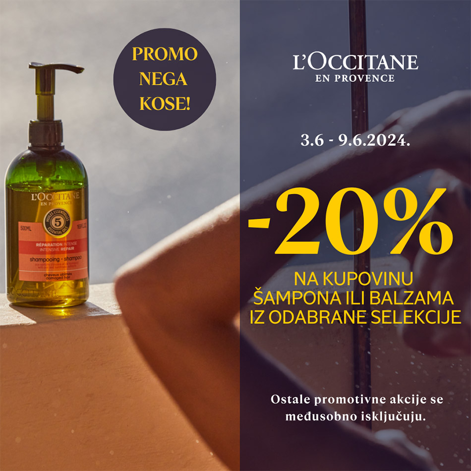 Obradujte svoju kosu! Do 9.6. iskoristite 20% popusta na odabrane šampone i balzame za kosu. Ne propustite priliku za negu koju vaša kosa zaslužuje! *Ostale promotivne akcije se međusobno isključuju.