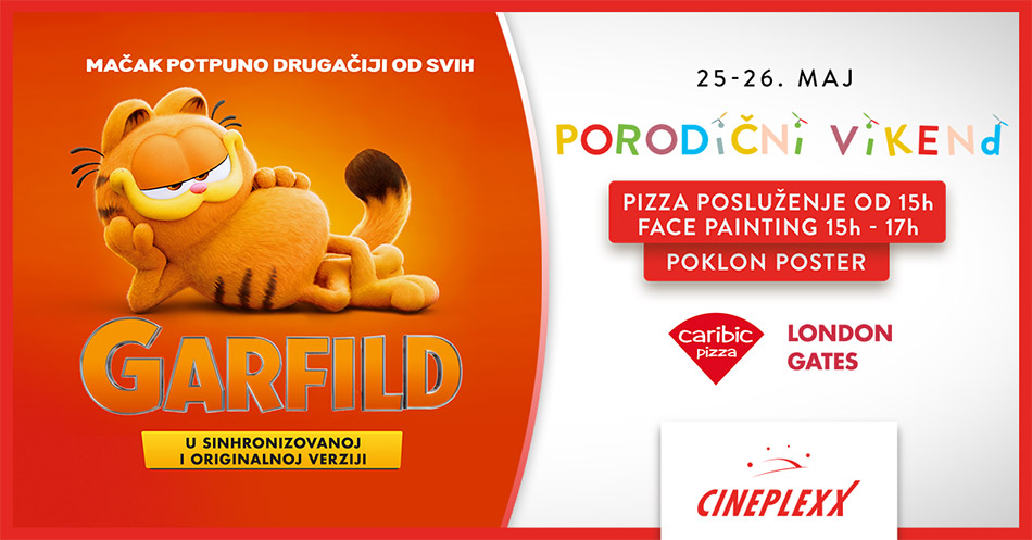 Pridružite nam se na specijalnom događaju za sve uzraste u subotu i nedelju, 25. i 26. maja. Priredite vašim mališanima nezaboravnu zabavu u omiljenom bioskopu, jer će u Cineplexxu biti organizovan face painting (od 15 do 17h), kreativna radionica, i čekaće vas jedno od Garfildovih omiljenih jela – pica iz čuvene picerije Caribic (od 15h)! Osim toga, naši najmlađi dobiće na poklon i postere sa likom omiljenog narandžastog mačka.*