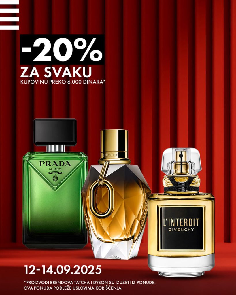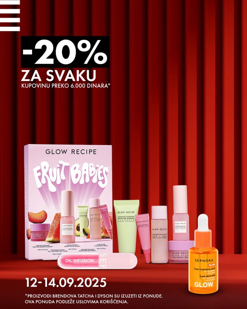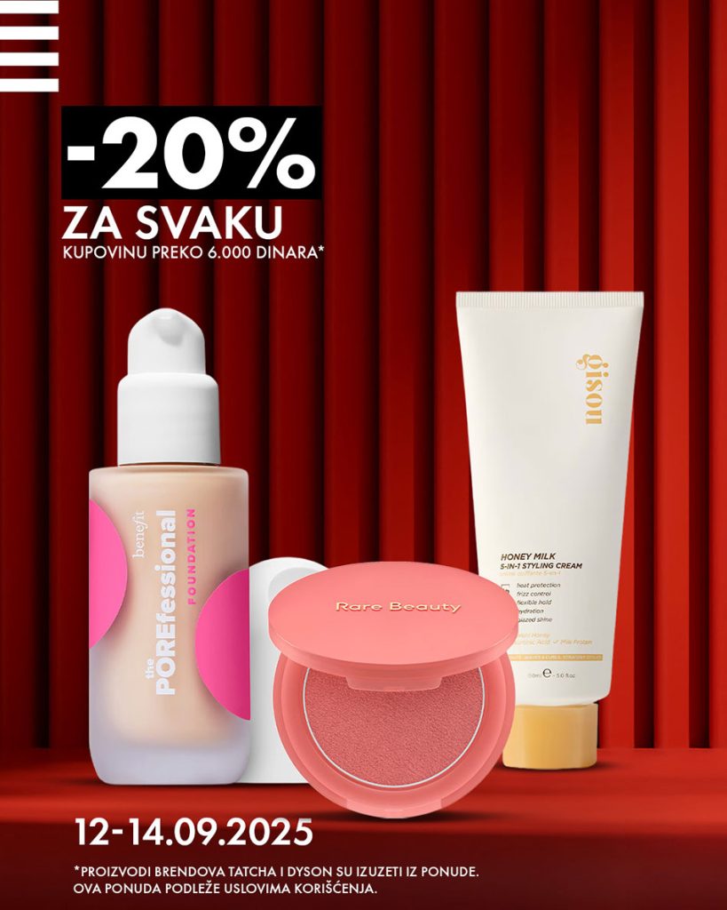 Sephora ce u periodu od 12-14.09 imati popuste od 20 % na sve racune preko 6.000,00 RSD , popust se nece odnositi na brendove Dyson I Tatcha.