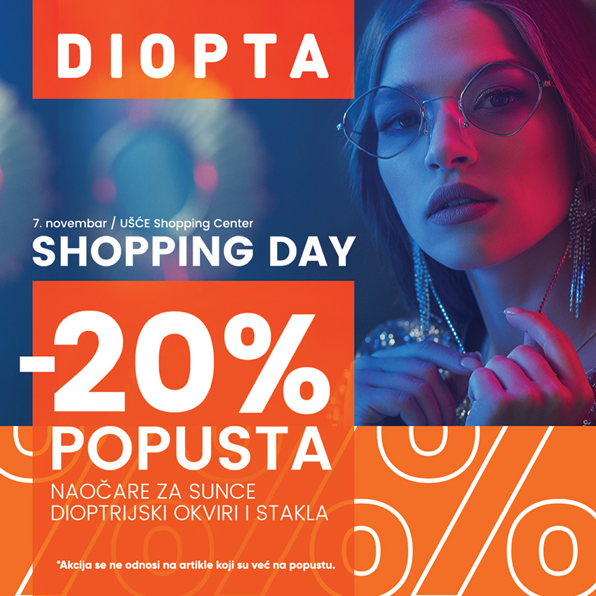 U okviru Ušće šoping dana, u Diopta radnji vas očekuje 20% POPUSTA na dioptrijske ramove i stakla, kao i na naočare za sunce.