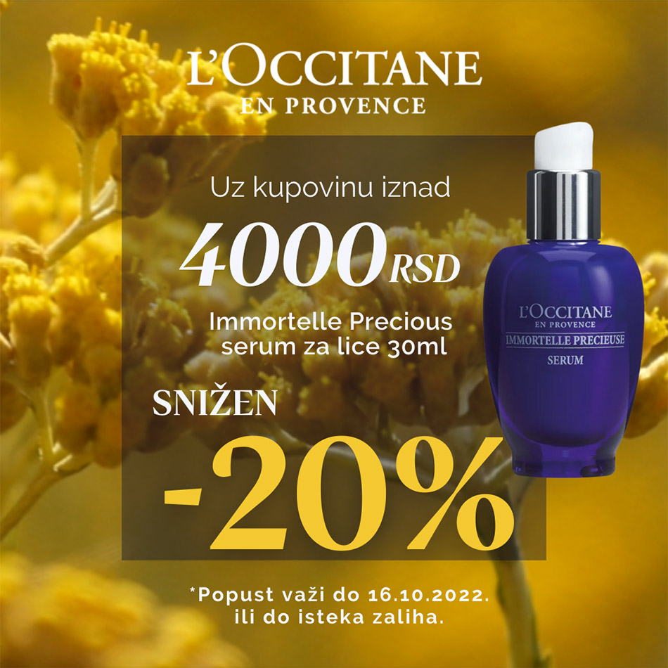 Do 16.10. uz kupovinu iznad 4,000 RSD kupite Immortelle Precious Serum za lice 30ml sa popustom od 20%.