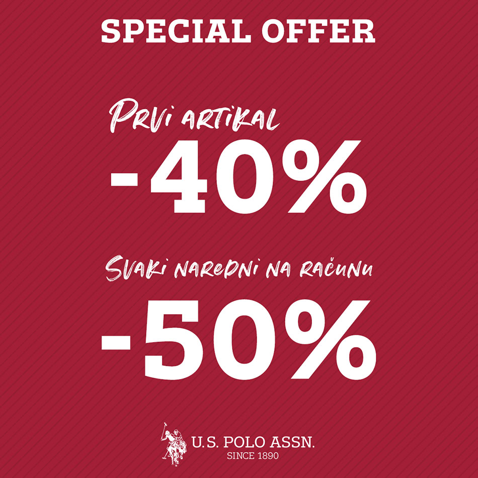 Prvi artikal koji kupite ima popust od -40%, a svaki naredni na računu -50%! 🤩✨ Ne propustite priliku da se obradujete omiljenim U.S. Polo Assn komadima! Samo u našim radnjama, akcija ne važi online! 💃🕺