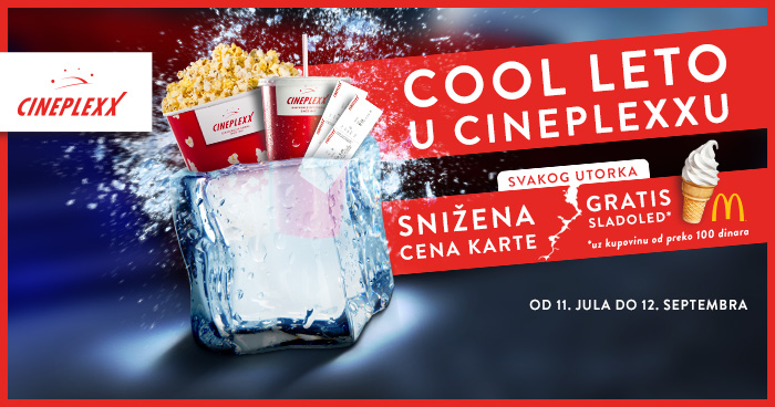 Cool leto u bioskopima Cineplexx zvanično počinje 11. jula i traje do 12. septembra, kada te svakog utorka u ovom periodu, pored uživanja u omiljenim filmovima očekuje i snižena cene karte! Za potpuno cool i osvežavajuće letnje uživanje, svakog posetioca uz kupljenu ulaznicu očekuje i poklon vaučer* za sladoled u McDonald’s restoranima u UŠĆE Shopping Centru, Delta Citiju i BIG FASHION šoping centru u Beogradu, STOP SHOP ritejl parku u Nišu i Kragujevac Plazi.