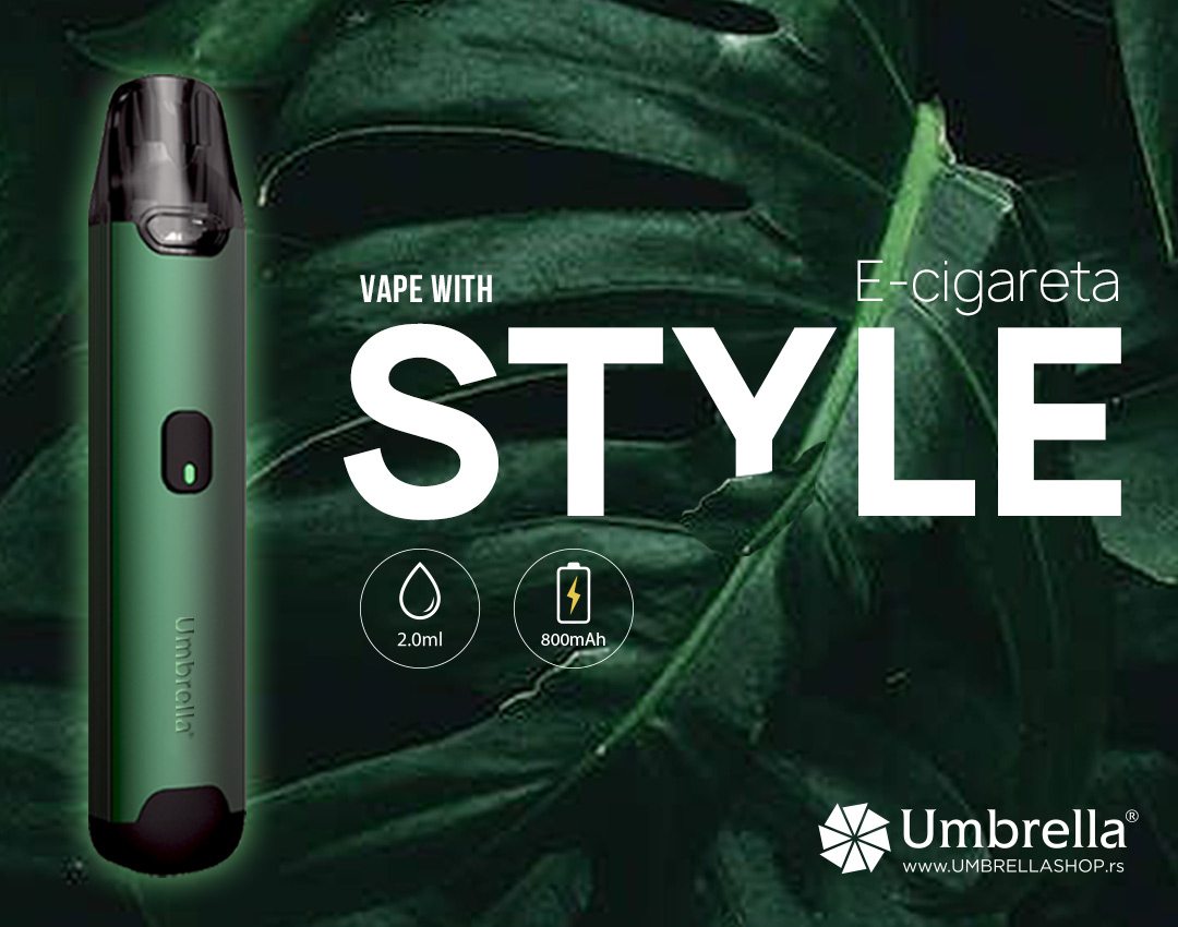 Umbrella STYLE je elegantan POD model malih dimenzija. Ima bateriju od čak 800mAh, a kapacitet POD tanka mu je 2 ml tečnosti.