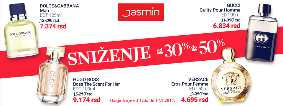 VELIKO SNIŽENJE od 30% do 50% najprodavanijih parfema DOLCE&GABBANA, GUCCI, VERSACE, HUGO BOSS, PACO RABANNE. Akcija traje do 17.9. u JASMIN parfimeriji u UŠĆE Shopping Centeru. Vise informacija https://goo.gl/JU12f2
