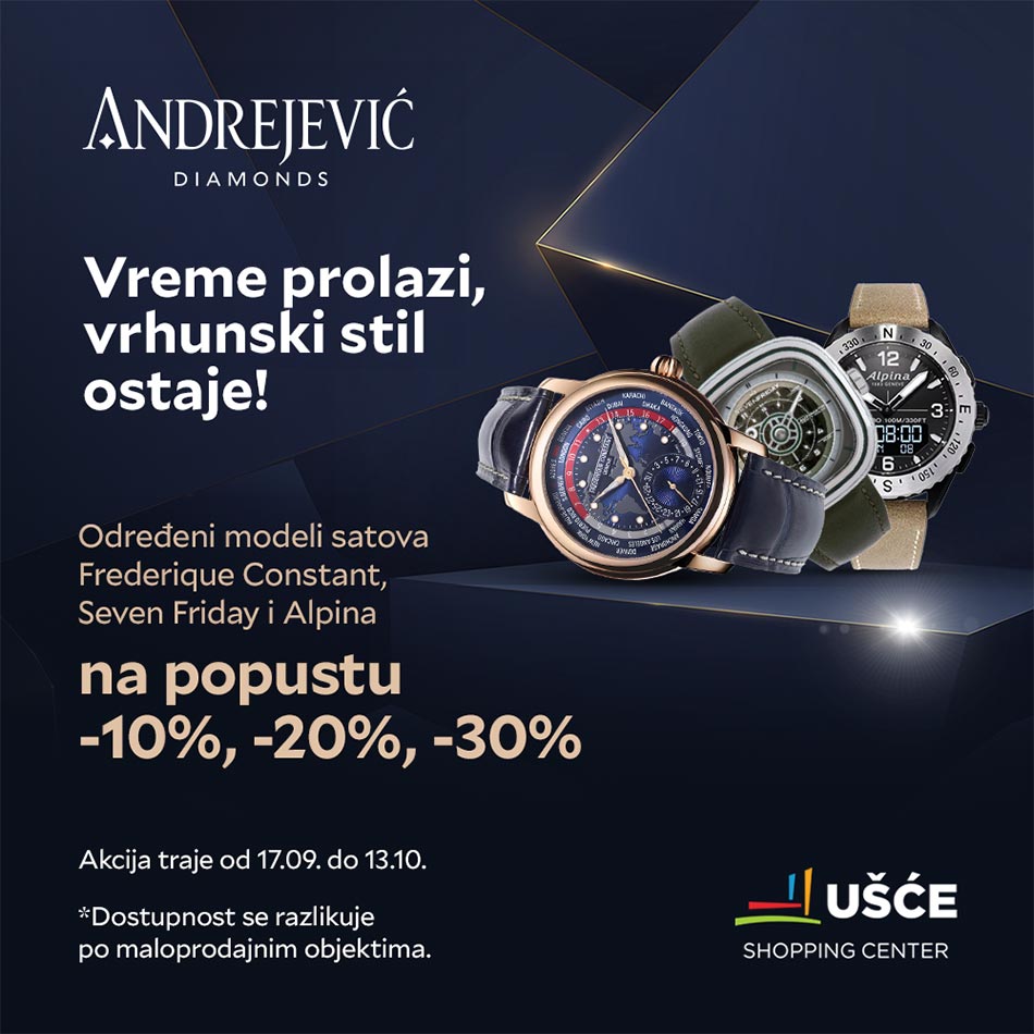 U periodu od 17.09 – 13.10.2024. promocija satova u zlatari Andrejević popust na izdvojene komade 10%, 20% i 30% na brendoveFrederique Constant, Alpina i Seven Friday.