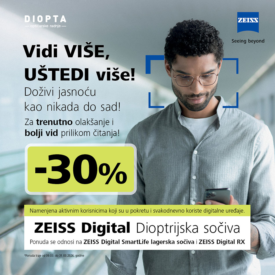Ako provodite mnogo vremena uz ekrane, pravi je trenutak da iskoristite čak 30% popusta na ZEISS Digital dioptrijska sočiva.