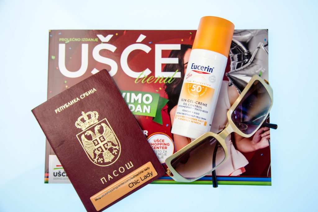 Pošto prirodno imam svetlu put, vodim dosta računa o zaštiti od Sunca. Moj strah od sunčanih fleka, pega i bora je učinio da od proleća na svoje lice, vrat, dekolte i ruke nanosim “Eucerin” kremu sa zaštitnim faktorom 50+. Prija mi njena lagana tekstura i mogu opušteno da uživam u blagodetima Sunca dok uživam u prizorima mora i plovila koji se ljuljuškaju na talasima. Ali kada kažem zaštita, između ostalog, mislim i na kvalitetan kofer koji ću bezbrižno predati u avion, u kojem ću složiti sve one divne stvari koje mi fenomenalno stoje ovog proleća. Naravno, nosim i torbu za avion iz “Piquadro” kolekcije u kojoj ću spakovati vrednije stvari i sitnice koje mi mogu koristiti dok ne stignemo u hotel.