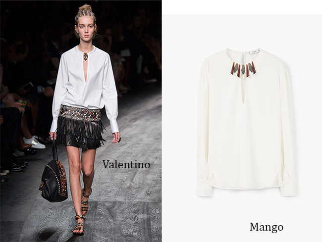 Tako na primer à la Valentino belu košulju sa širokim rukavima, prorezom do grudi i našivenim etno detaljima možete pronaći u Mangu. Takođe u istoj radnji nalazi se i omaž sa njihovim čuvenim sandalama u špic sa nitnama i kaišićima. U delu sa cipelama čekirajte Mango verziju u vatreno crvenoj boji (ako mene pitate, ja već izmišljam prigodu da ove lepotice povedem u šetnju).