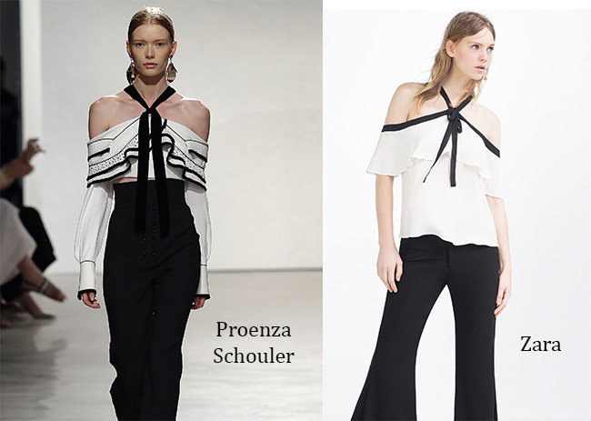 Dizajn duo Proenza Schouler su proleće zamislili u duhu Španije i flamenka (jedan od većih trendova, oslobodite latino divu u sebi), njihov model kombinuje crno-bele karnere i traku oko vrata na elegantnoj bluzi. Zara dodatano razrađuje njihov predlog donoseći vrrrrrloo sličnu košulju, ali sa tri četvrt rukavima. Ja se već spremam da je izvedem na đuskanje!