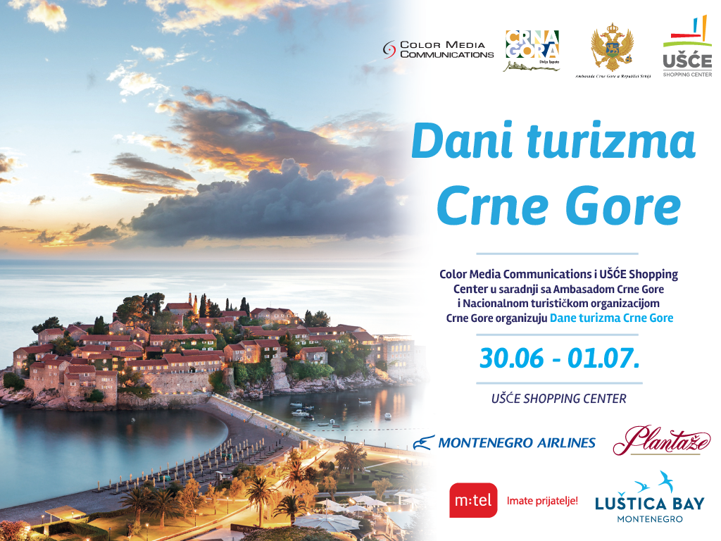 Dobro poznate reči Bajagine pesme “Montenegro” sve nas zovu na putovanja, a ovaj put vas Montenegro zove u Ušće! Dani turizma Crne Gore pod nazivom “Montenegro zove tebe u Ušće” održaće se u petak 30.06. i subotu 01.07. 2017. od 10-22h na glavnom trgu UŠĆE Shopping Centera.