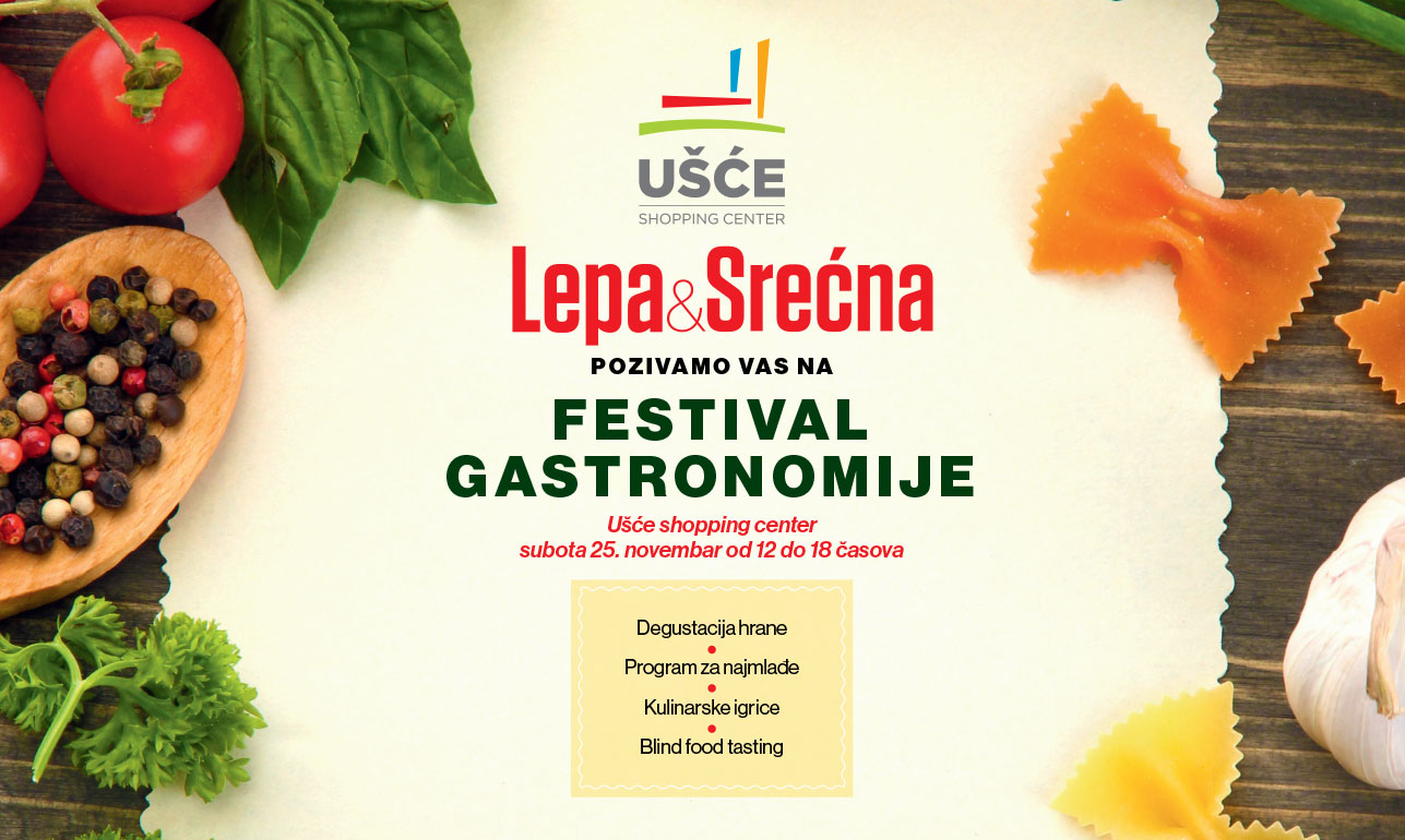 Ove subote, 25. novembra od 12 do 18 časova u UŠĆE Shopping Centeru vas očekuje atraktivan zabavni program, kuvanje sa decom, degustacija hrane i brojni pokloni, a u okviru Festivala Gastronomije. Deca će ovom prilikom uživati u kreativnim kulinarskim radionicama ali i slasnim zalogajima. Oni koji nisu spremni na odricanje od hrane, a žele da ostanu fit tokom zimskog perioda, uživaće u savetima nutricioniste.