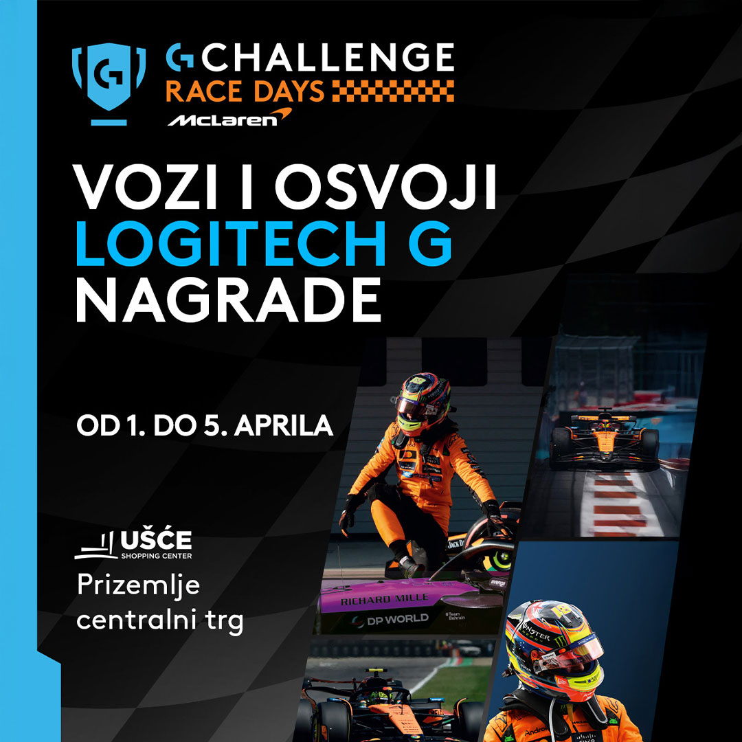 Od 1. do 5. aprila u UŠĆE Shopping Centeru te čekaju G-CHALLENGE Race Days by McLaren, adrenalinska vožnja i prilika da osvojiš sjajne Logitech G nagrade.
