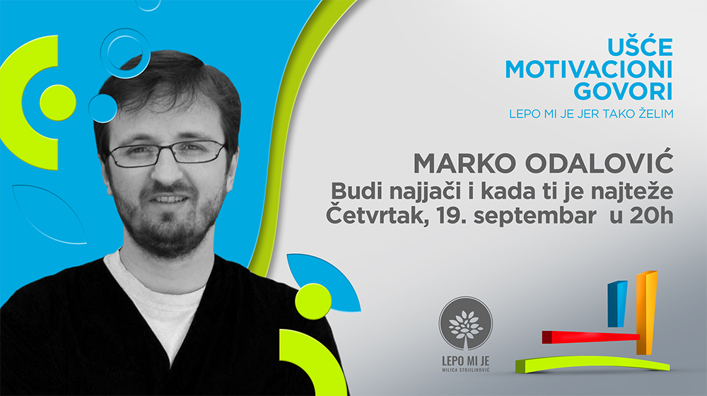 Nakon jubilarnih 20 predavanja, sledi nova sezona motivacionih govora, pod već prepoznatljivom porukom „Lepo mi je, jer tako želim“, koje organizuju UŠĆE Shopping Center i Centar za lični razvoj „Lepo mi je“. Sledeći predavač biće Marko Odalović, naš najinovativniji veterinar, čija će životna i poslovna priča promeniti pogled na život svih koji budu sedeli u publici. On će, u četvrtak, u Cineplexx sali, 19. septembra 2019, govoriti na temu „Budi najjači i kada ti je najteže“.