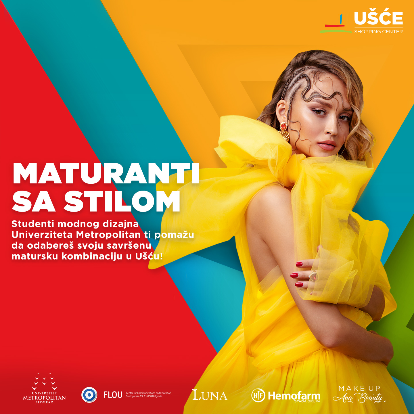 Konsultantske usluge studenata Modnog dizajna Univerziteta Metropolitan koji će biti u ulozi stilista i na raspolaganju maturantima, obavljaće se u UŠĆE SC, poslednja dva vikenda u maju (18/19. i 25/26. 2019. godine) od 12 do 21 časova. Svi oni koji su zainteresovani da imaju ličnu asistenciju mladih dizajnera pri izboru svoje savršene maturske kombinacije, mogu se prijaviti slanjem poruke u inbox na Facebook strani – UŠĆE Shopping Center.
