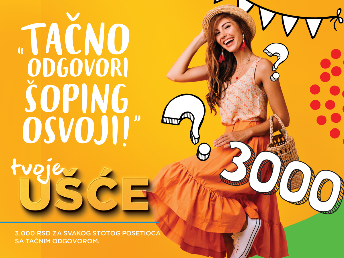 Sve što treba da uradiš je da dođeš za vikend 4. i 5. jula u UŠĆE SC do našeg pulta u prizemlju centra i čekiraš se – jer svaki 100. posetilac koji tačno odgovori na naše postavljeno pitanje osvaja šoping vaučer za kupovinu u centru u vrednosti od 3.000 dinara.