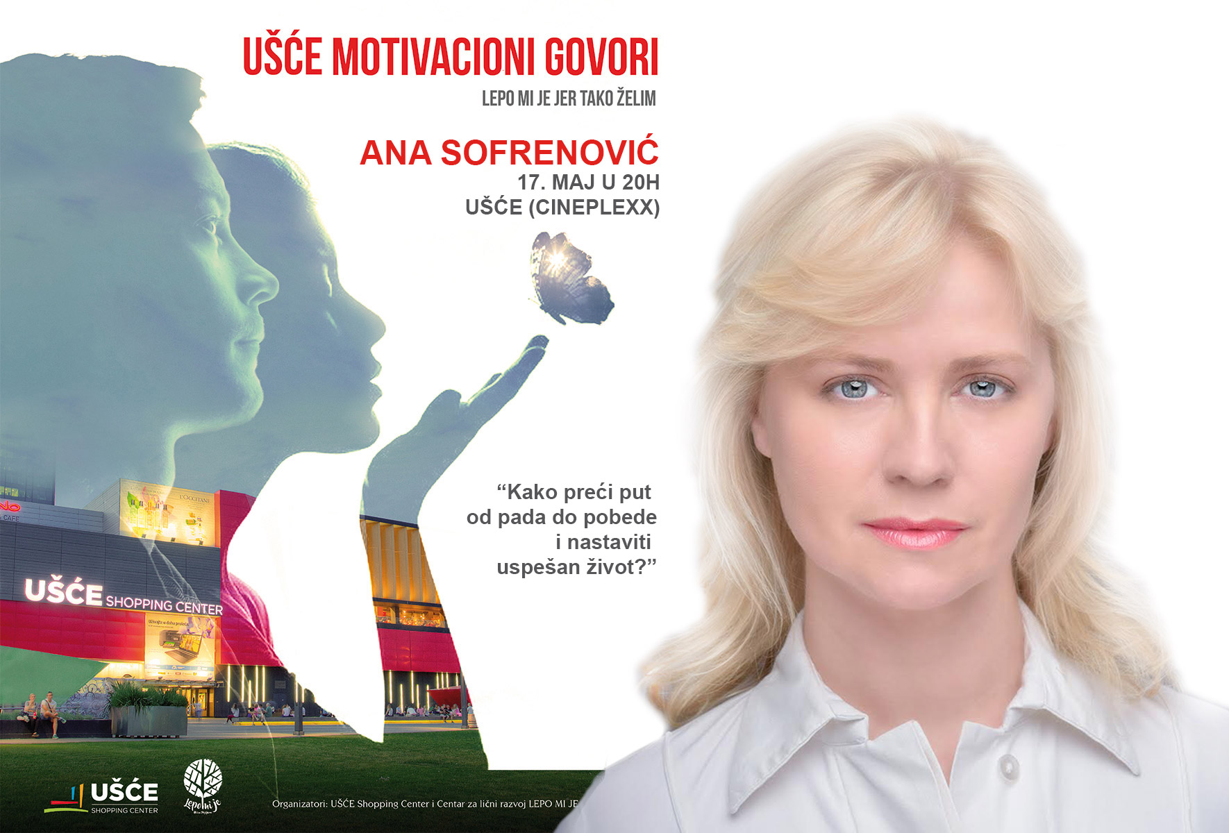 Glumica i pevačica, Ana Sofrenović održaće u četvrtak, 17. maja u 20 časova, predavanje na temu „Pad do pobede“ u bioskopskoj sali UŠĆE Shopping Centera. Njen govor biće treći po redu u novoj sezoni motivacionih govora koje UŠĆE Shopping Center i Centar za lični razvoj LEPO MI JE i organizuju drugu godinu za redom, uz poruku „Lepo mi je, jer tako želim“.