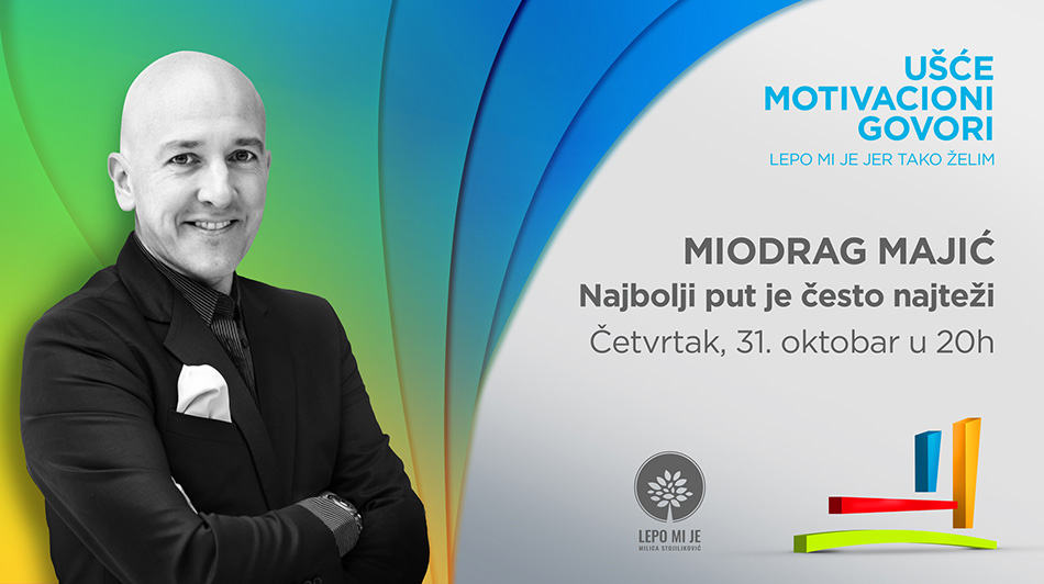 UŠĆE MOTIVACIONI GOVORI, koje UŠĆE SC organizuje sa Centrom za lični razvoj LEPO MI JE uz poruku projekta „lepo mi je, jer tako želim“ postaju mesto inspiracije sve većem broju ljudi, koji žele da nađu odgovore na razne životne teme i bolje upoznaju svoju ličnost i sve ono što im se događa. Naredno motivaciono predavanje održaće Miodrag Majić, sudija i pisac, koji će govoriti na temu zašto je najbolji put često najteži. Predavanje će se održati u Sali 10 bioskopa Cineplexx UŠĆE Shopping Center u četvrtak 31. oktobra u 20 časova.