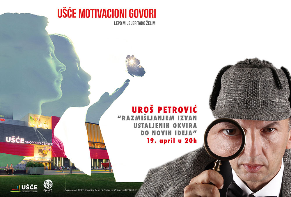 Beograd, april 2018. godine – Drugo predavanje u drugom ciklusu motivacionih govora u UŠĆE Shopping Centeru održaće 19. aprila u 20 časova, pisac Uroš Petrović, na temu – “Kako razmišljanjem izvan ustaljenih okvira doći do novih ideja i rešenja”. Uz poruku “Lepo mi je, jer tako želim” UŠĆE Shopping Center i Centar za lični razvoj LEPO MI JE organizuju novi ciklus predavanja, nakon sedam uspešno održanih tokom prošle godine.