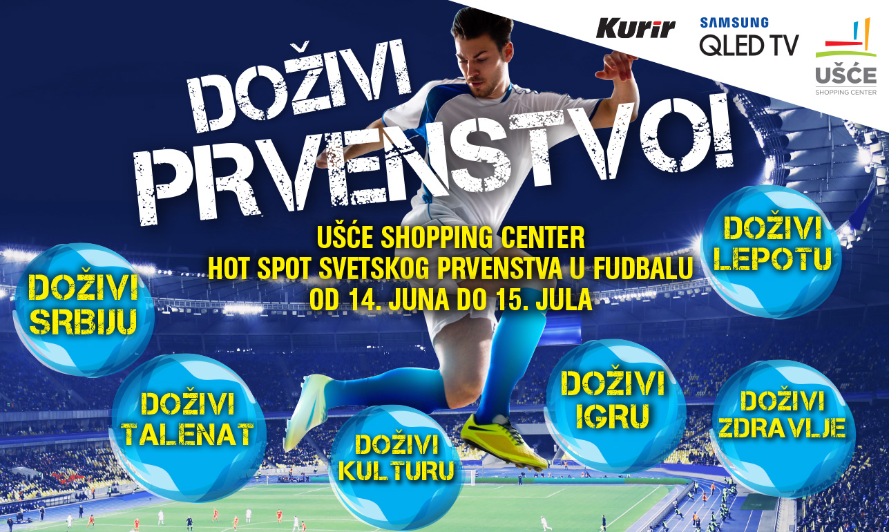 U periodu od 14. juna do 15. jula UŠĆE Shopping Center i Kurirov sajt postaju HOT SPOT svetskog prvenstva u fudbalu. Na centralnom trgu u prizemlju UŠĆA svakoga dana između 12 i 20 časova sve posetioce očekuje nezaboravan provod. UŠĆE postaje mesto gde se spajaju, inspirišu i aktiviraju talenti, koje pokreće i motiviše svakog pojedinca, dajemo podršku svima kojima je potrebna, učestvujemo u zabavnim aktivnostima, i sve to kroz promociju Srbije i brojnih mogućnosti koje nudi. Pored toga, tokom 32 dana u centralnom holu UŠĆE SC biće postavljen studio iz kojeg ćemo svakodnevno pre i posle svake važnije utakmice emitovati program sa najrazličitijim gostima koji će cela Srbija moći da prati uživo.
