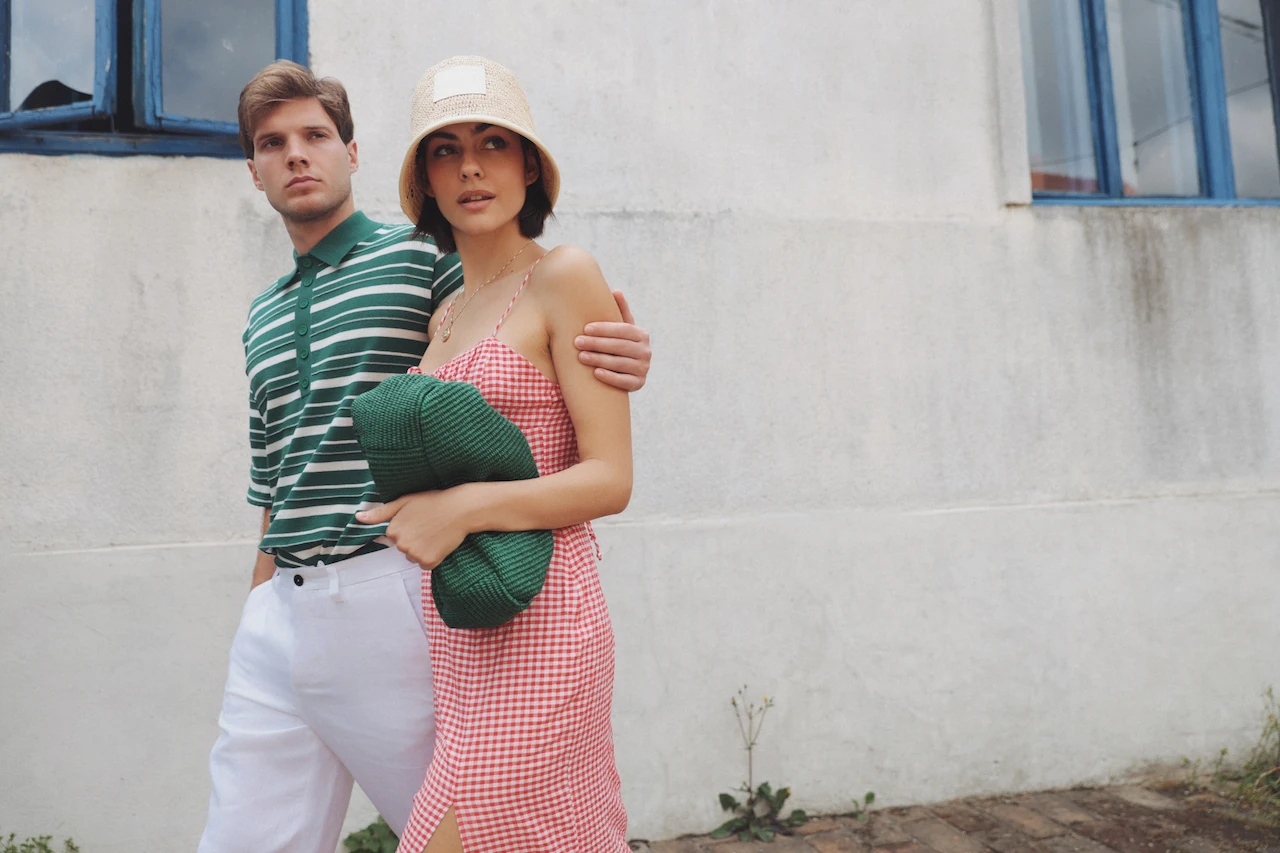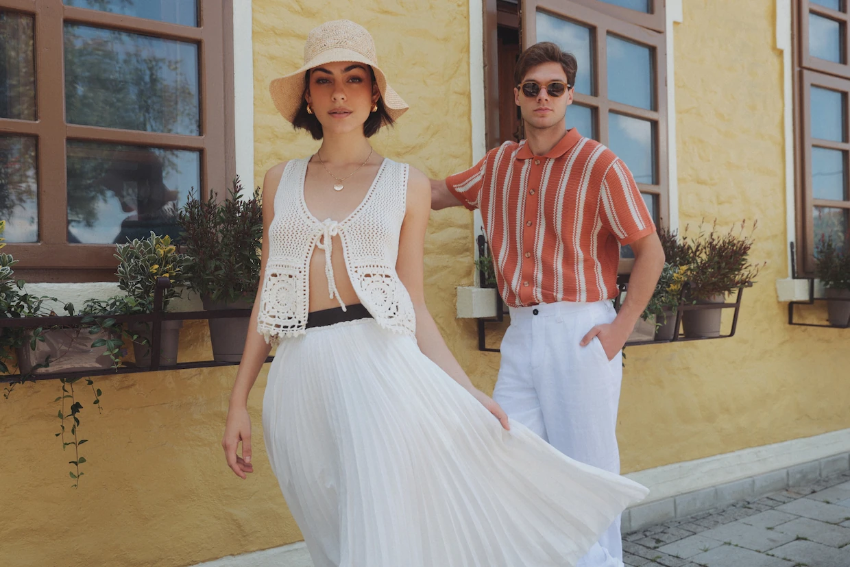Kada se spoje lagana bela plisirana suknja i končani prsluk s vezivanjem, rezultat je romantičan, prozračan i šik. Upareno sa slamnatom kapom i zlatnim detaljima u nakitu, ovaj stil nosi poruku: manje je više, ali sa stilom. S druge strane, muška kombinacija – prugasta polo majica u toplim tonovima i bele lanene pantalone – nosi energiju mediterana, savršeno za gradski ambijent s dušom.